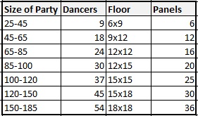 Ala Carte - Dance FloorWe offer a sectioned dance floor that can be configured from square to rectangular in sizes from 6x9 to 18x18. Our pricing includes delivery, set-up, take down and pick up.